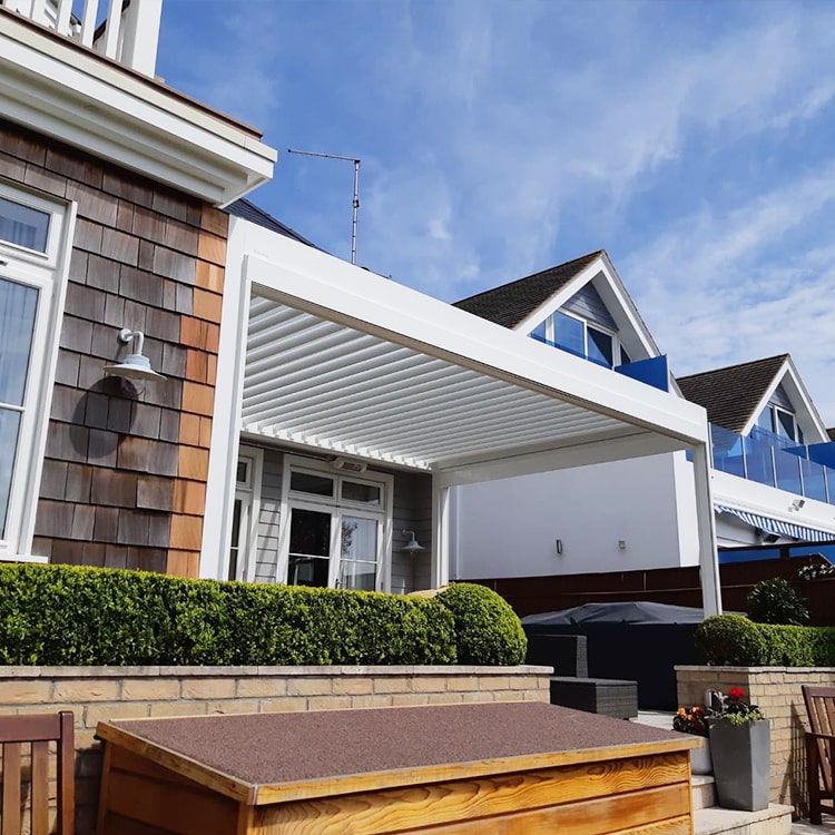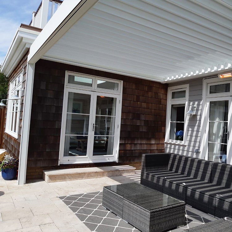 We suggested the B600 louvred patio roof structure to the client, as it would fit perfectly into the allocated patio space, hemmed by two of the property's walls. With both rotating and sliding roof capabilities, the B600 patio roof is the perfect all-purpose structure that can go between fully open, fully closed and all stages in between, giving the client total control over shading by use of remote control.