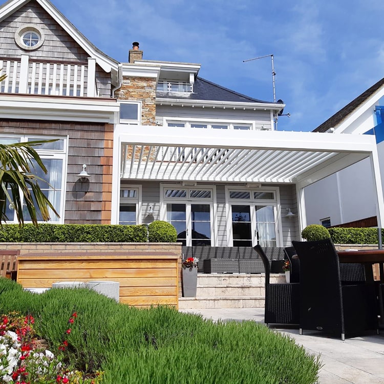 As the client had specified that they wanted their patio roof to double up as an extension, we installed custom-made electric side screens alongside remote controlled heating and LED lighting. Use of the side screens transforms the structure into an indoor room, perfect for those times when more privacy is desired or to shield against those sea winds.