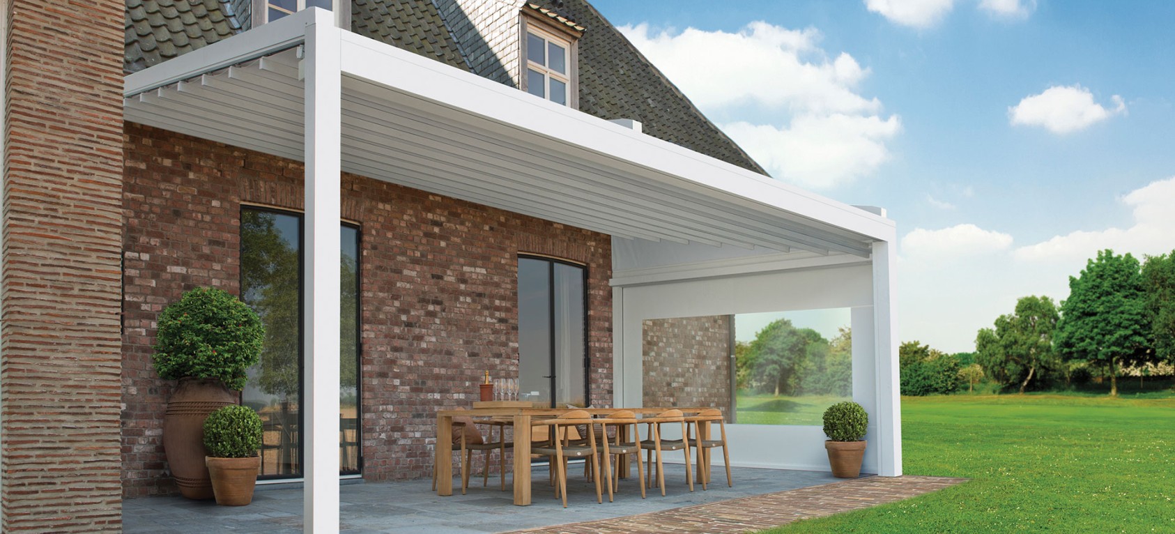 The SunRain System lean-to patio cover has an inclined roof with a heavy-duty PVC fabric that is waterproof. The fabric can be partially or fully opened up for partial or full light control and solar and rain protection. The fabric concertina’s backward and forward at the touch of a button.